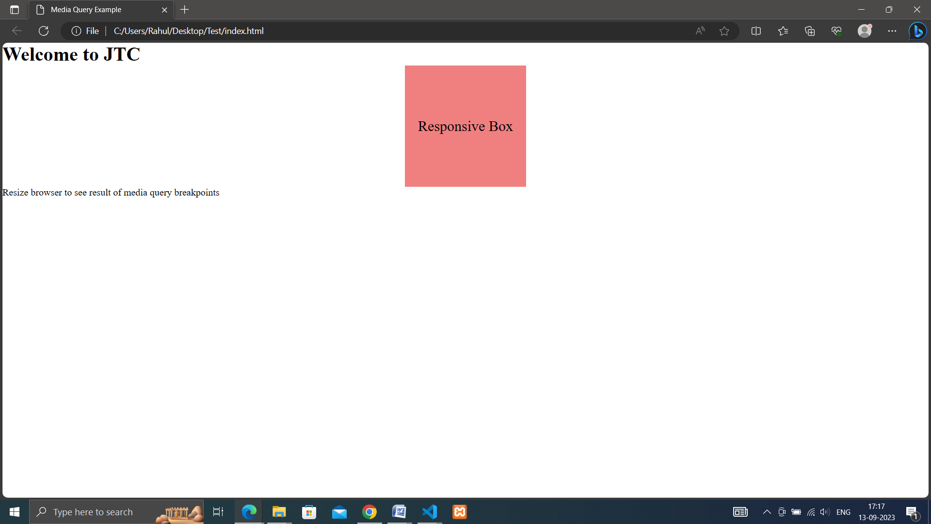 When you open the HTML file in a web browser and resize the browser window, you'll see that the background color and font size of the "Responsive Box" element change based on the defined media query breakpoints, demonstrating how the design adapts to different screen sizes
