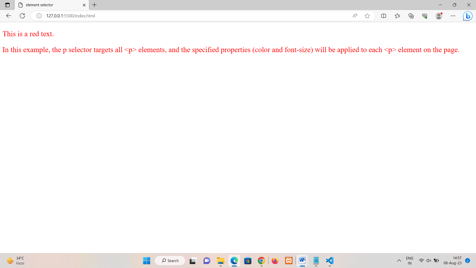 <p>In this example, the p selector targets all <p> elements, and the specified properties (color and font-size) will be applied to each <p> element on the page.</p>