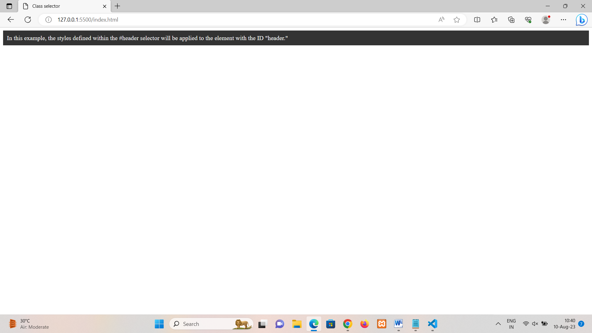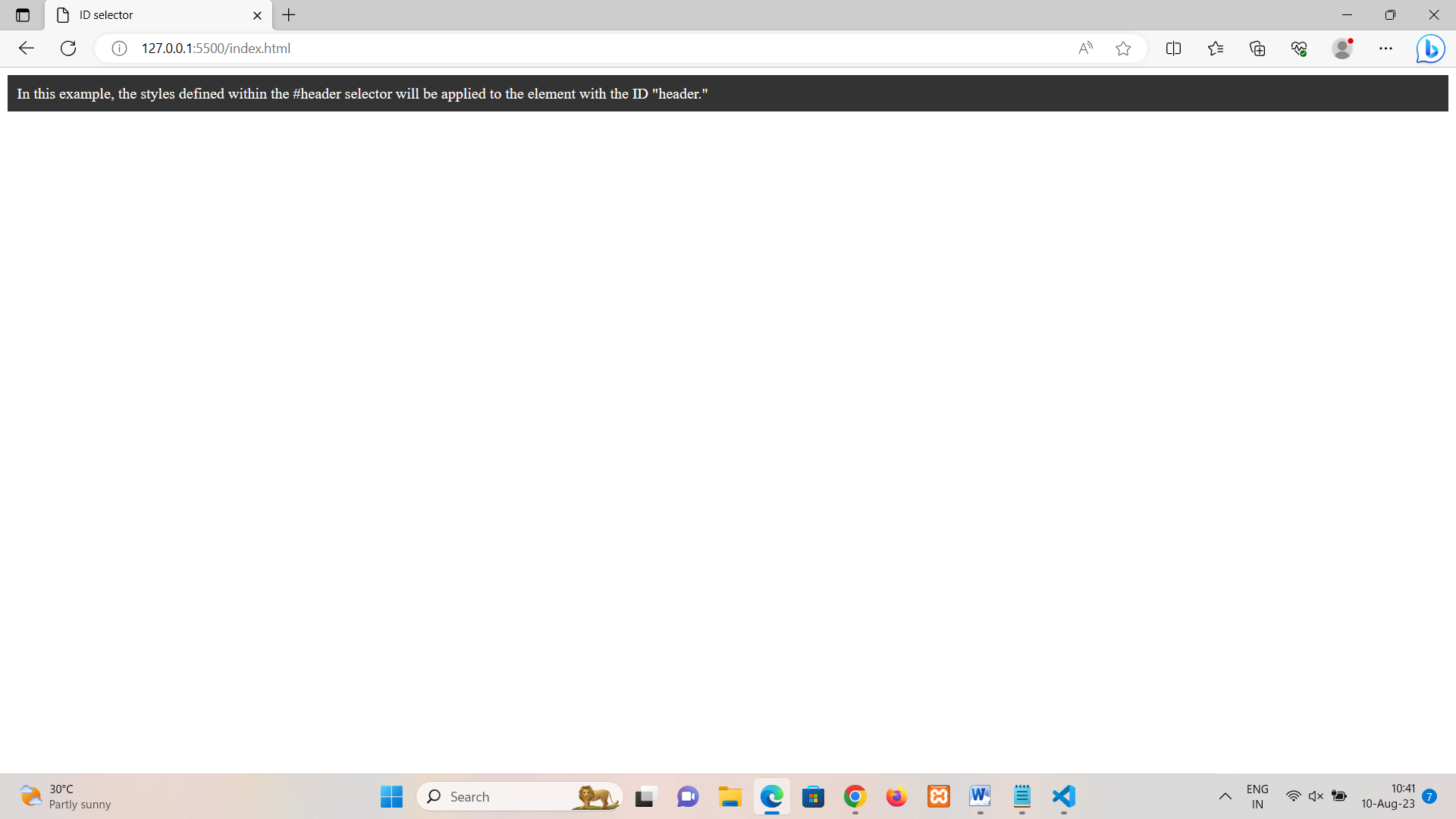 ID Selector:An ID selector in CSS is used to target and apply styles to a specific HTML element that has a unique ID attribute. Unlike class selectors, which can be applied to multiple elements, an ID selector targets only one element with the specified ID.