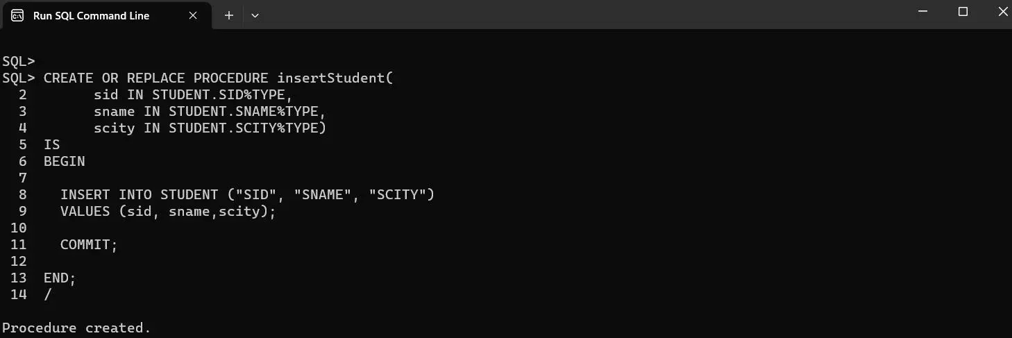 Example to create Stored Procedure for Insertion in Oracle Database.