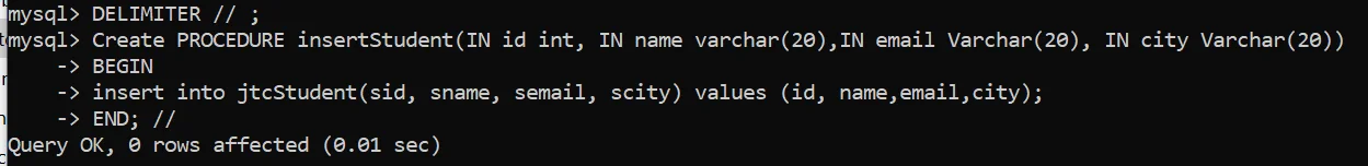 Create PROCEDURE insertStudent(IN id int, IN name varchar(20),IN email Varchar(20), IN city Varchar(20))