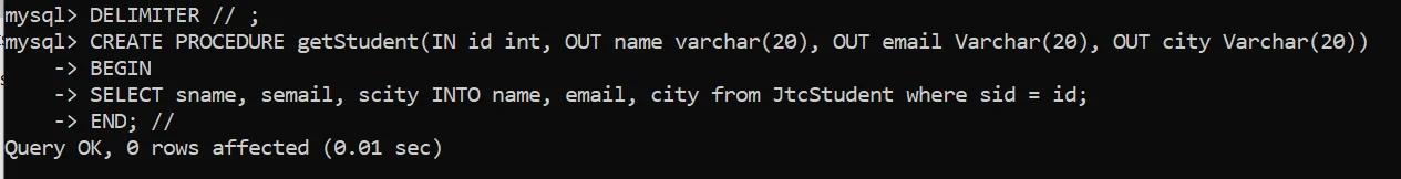 CREATE PROCEDURE getStudent(IN id int, OUT name varchar(20), OUT email Varchar(20), OUT city Varchar(20))