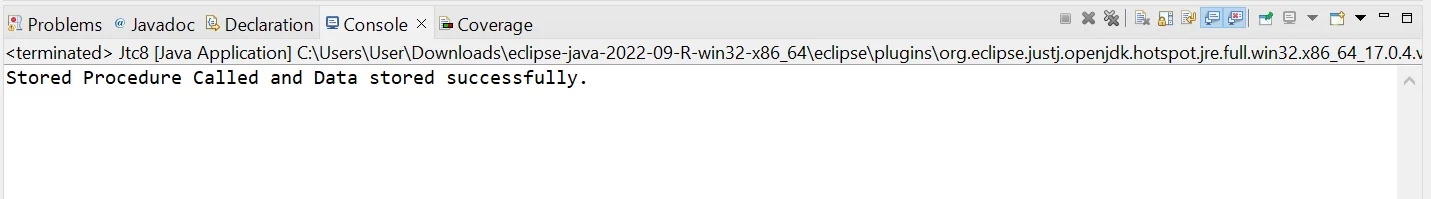 System.out.println("Stored Procedure Called and Data stored successfully.");