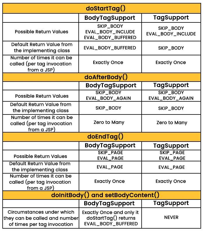 f tag handler class is extending BodyTagSupport, then you can use the following two extra life cycle methods in the Tag Handler class: